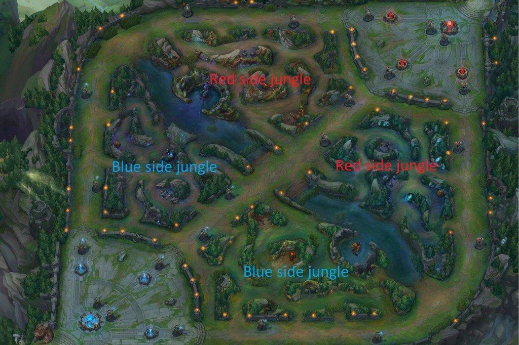 As for the rest of the map, the entire middle of the map, between bottom lane and top lane, is called the ‘jungle’. The jungle is broken down into four quadrants: