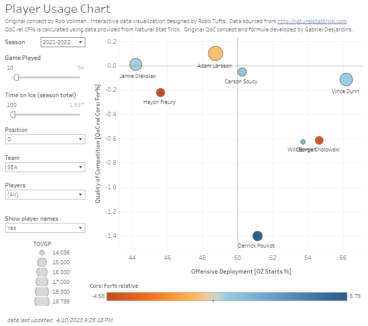 As for Soucy’s role, it actually got easier. His current playoff partner, Justin Schultz, was often his partner in the regular season. They were kept away from top competition and Soucy set a career-high by starting in the offensive zone 58.6% of the time; he had never had a full season over 50%. Though he got some tougher minutes in his first year with Seattle, that relaxed in Year 2.