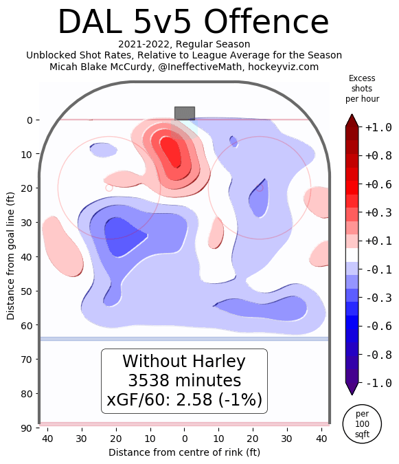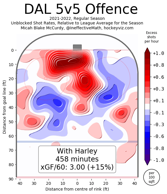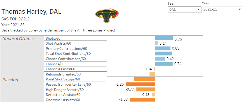 He didn’t play a lot of games, so it means a small sample to work with, but Harley showed very well basically everywhere in 2021-22. The team’s expected goals against/60 at 5-on-5 with him on the ice was 2.44, a number that rose to 2.53 with him off the ice. In the offensive zone, it was even better. This was Dallas’s attack with Harley on the ice:
