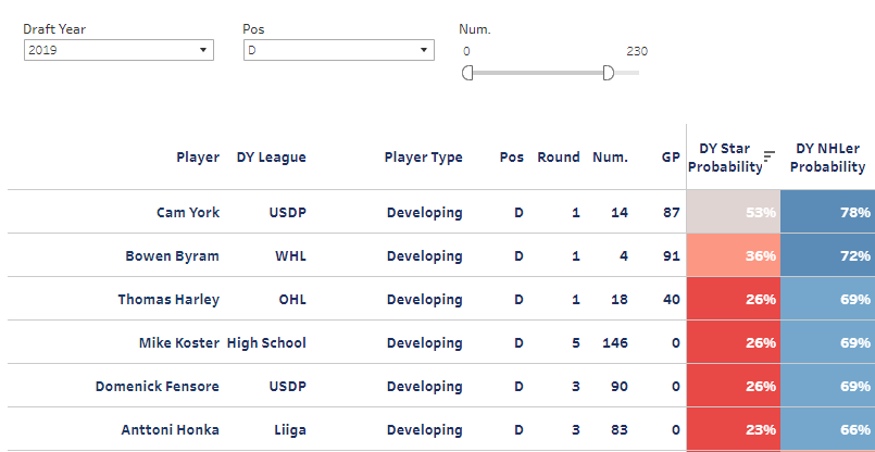 A final note on that 2019 draft class comes from Byron Bader’s prospect model. According to the model, there were six defencemen in the 2019 draft that had two attributes: at least a 20% chance at becoming a star, and at least a 66% chance of just becoming a regular NHLer. They were as follows: