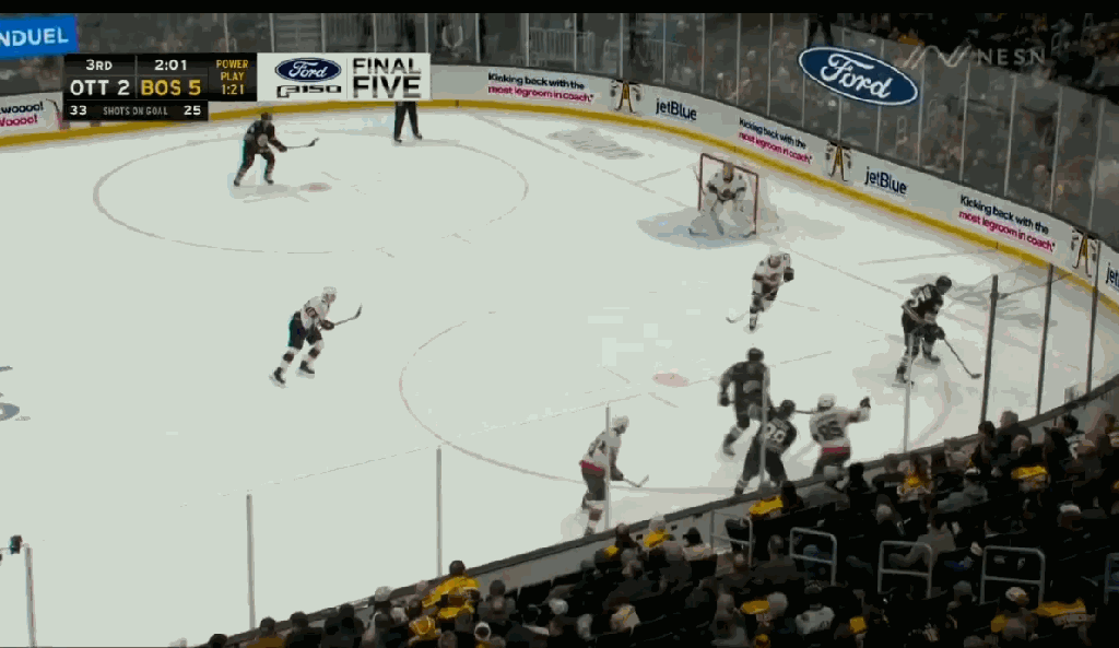 Ten days later, Ottawa was in Boston and got their brains beat in 6-2. The first goal against was from Justin Brazeau, who was standing in front of Korpisalo for the screen. He has time to corral the rebound, shift to his forehand, and bury the puck: