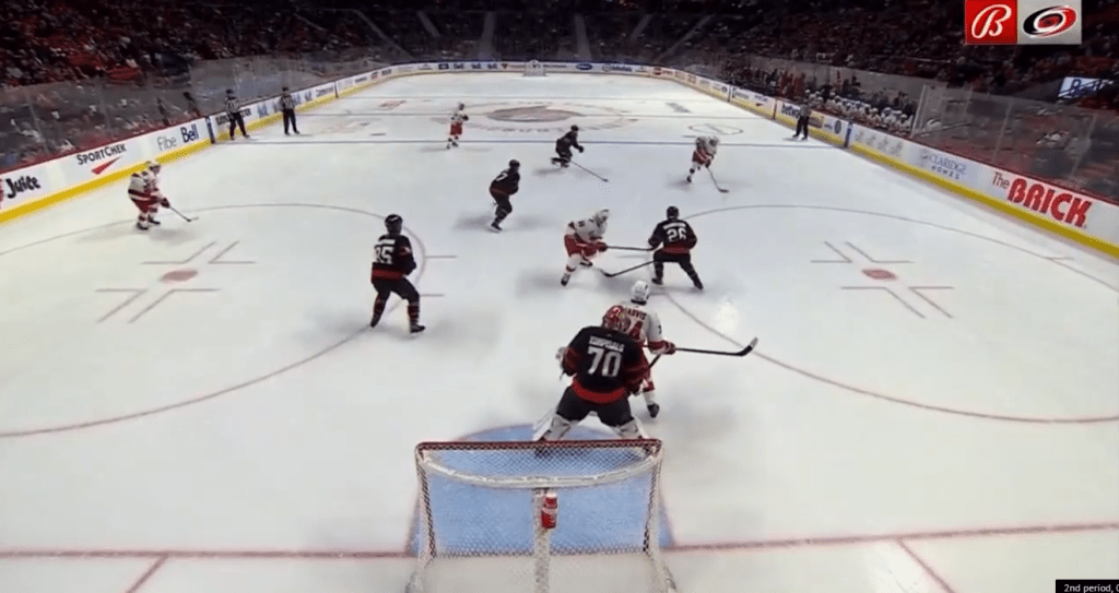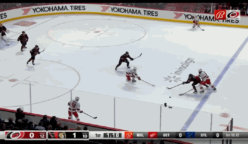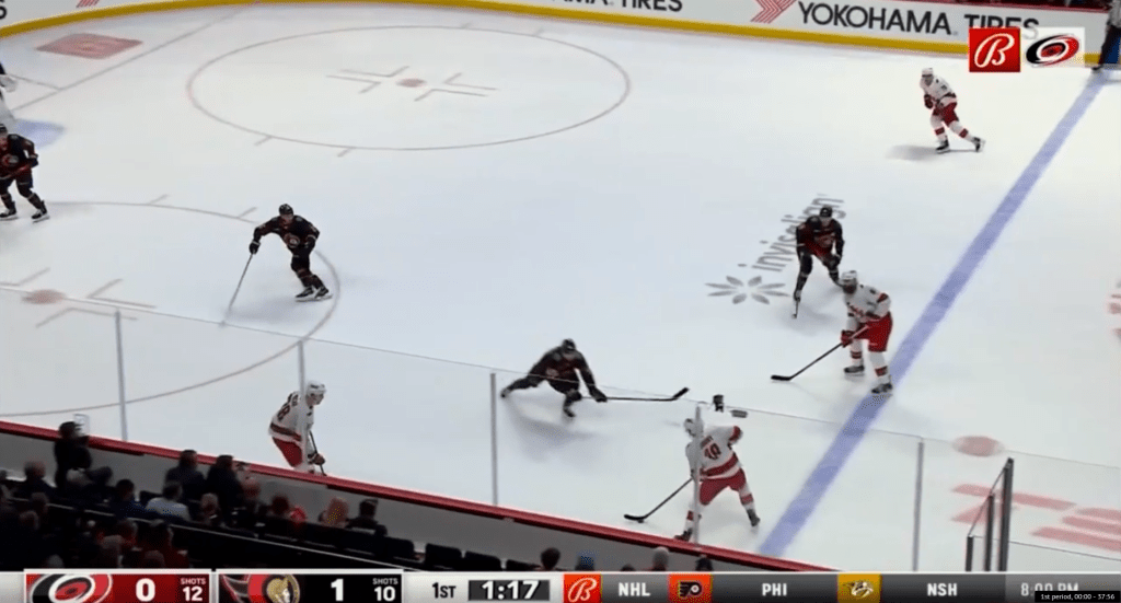 A couple of weeks later, Ottawa was at home to Carolina and gave up two more goals against. The first one was a case of over-aggression as Carolina had a fumble at the blue line, and that got two Ottawa Senators forwards chasing towards the neutral zone. That left two-thirds of the offensive zone wide open:
