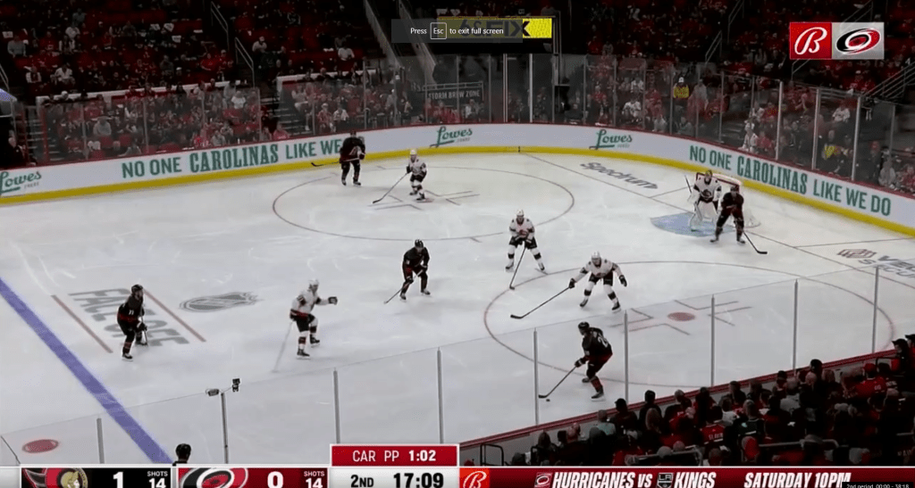 We have seen complete breakdowns, failures to clear the zone, over-chasing a defenceman, and just bad decision-making. However, this goal highlights one additional issue that is recurring: indecisiveness. There were a couple times where just a quick feint towards the wrong player left an Ottawa penalty killer one step behind where he should be, and with the talent in the league being where it is now, being one step behind leaves open passing lanes leading to easy goals. That indecisiveness crops up again and again and is a symptom of having an aggressive penalty. It is good to be aggressive – Carolina has thrived for years doing that – but failing to make any decision at the right time can be as detrimental as making a bad decision. That indecision opens lanes that shouldn’t be open, and leaves the goalies hung out to dry.