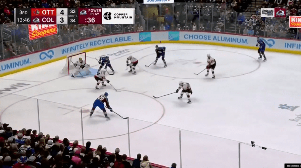 The second goal against was pure fatigue. Senators forwards Tim Stützle and Ridly Greig both jumped on as the second unit with about 1:15 left in the penalty kill. The puck was in Colorado’s zone, so they had to skate back to their end, but an Avalanche turnover led to Stützle and Greig having a 2-on-1 back the other way. They didn’t score and had to skate back to their end of the ice, making it three trips to one end of the rink or the other in about 25 seconds. Ottawa was gassed and couldn’t apply pressure, the Avalanche threw the puck around a bit, and that led to another MacKinnon cross-seam one-timer. Korpisalo actually saved that, but when defenceman Jacob Bernard-Docker tried to clear the rebound, he just passed it right to Mikko Rantanen, who fired it home into a mostly-empty net: