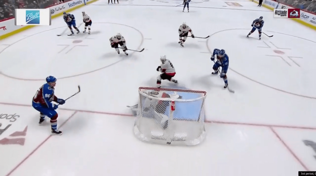 However, Jonathan Drouin one-touched the puck back to MacKinnon, and Korpisalo was still looking for the puck in the bumper – partly thanks to the screen from Valeri Nichushkin right in front of him – even as MacKinnon was about to slap home a one-timer for the goal: