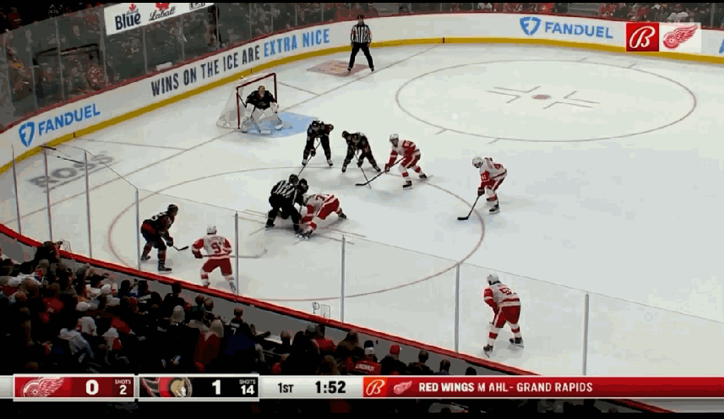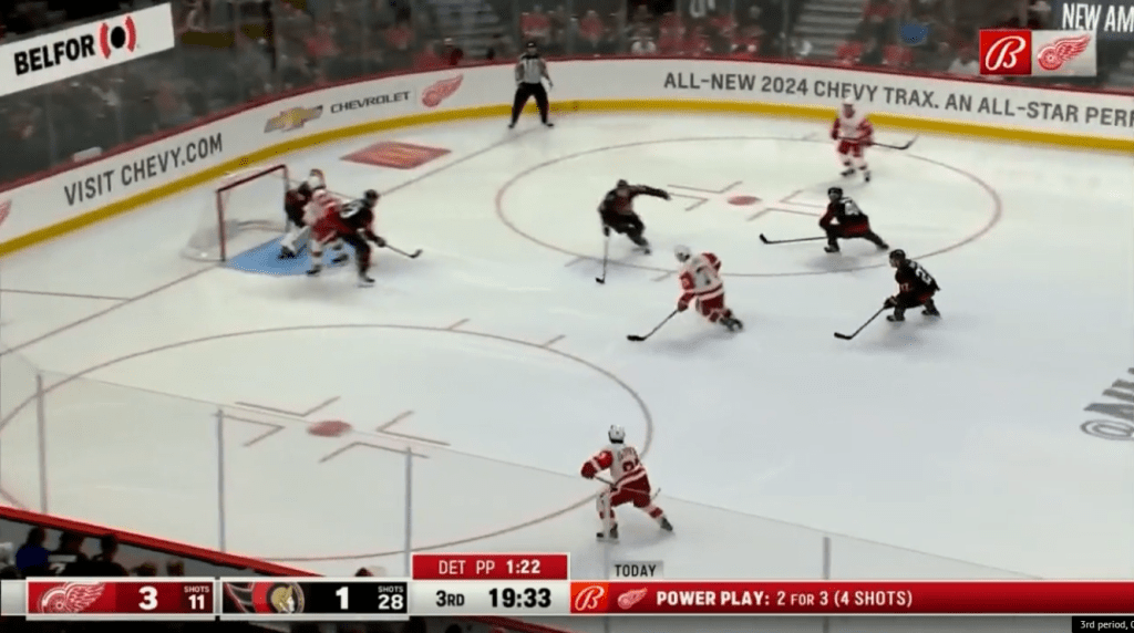 Dylan Larkin wins the faceoff to Moritz Seider, so Mathieu Joseph rushes out to put on pressure. Claude Giroux follows the supporting Detroit forward, who promptly makes a pass deep into Ottawa’s zone to his supporting forward. He one-touches it to Larkin and in a span of literally five seconds, Detroit has completely broken Ottawa’s PK ‘structure’ to create a 2-on-1 down low, which is a one-timer promptly fired home by Shayne Gostisbehere: