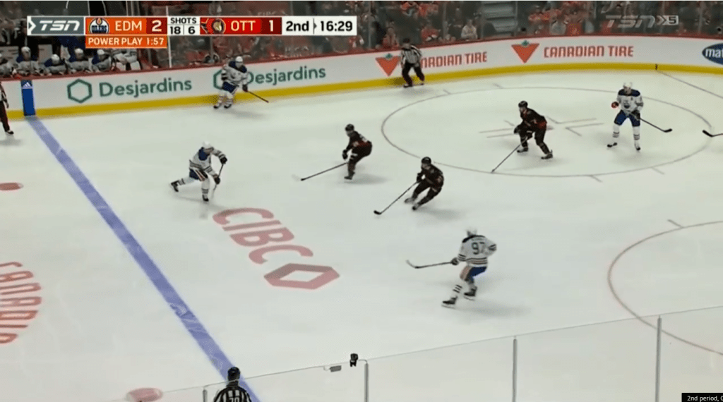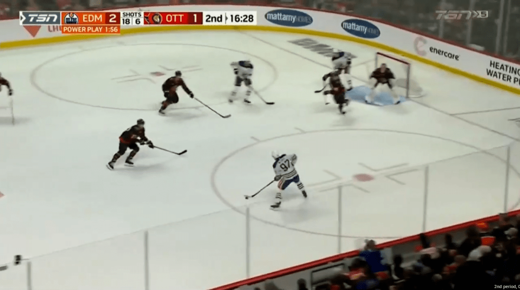 Ottawa’s weakside defenceman had a moment of hesitation towards the blue line, and that left Leon Draisaitl and Zach Hyman in front on a 2-on-1. Probably not an ideal situation: