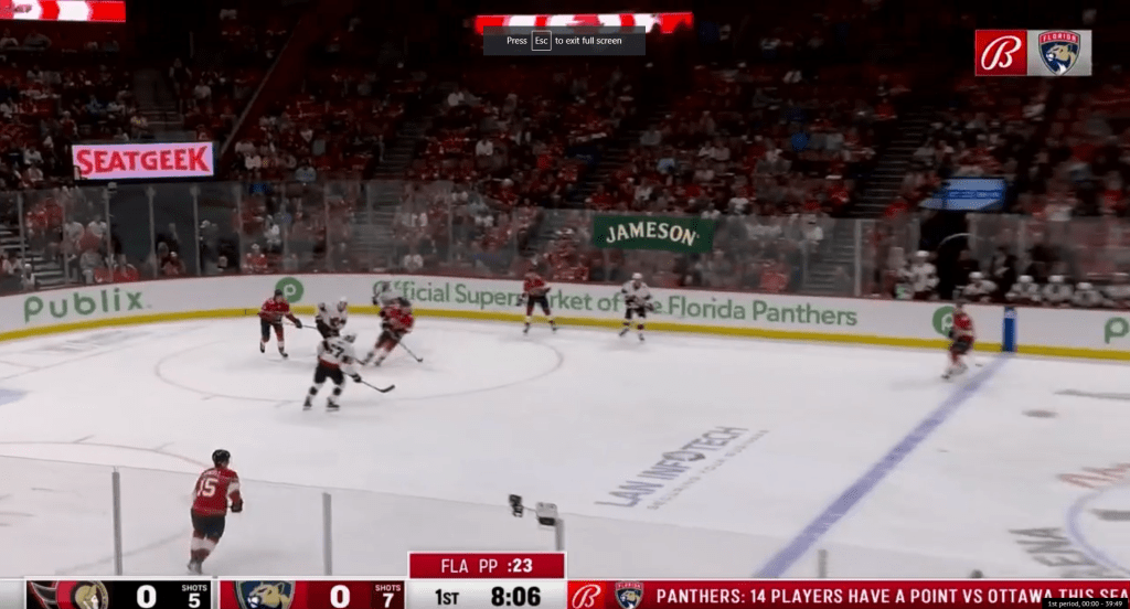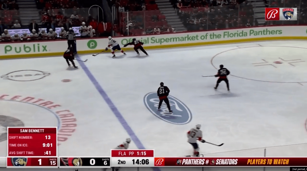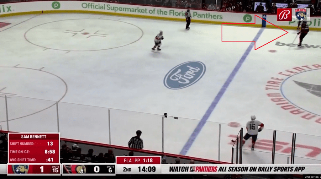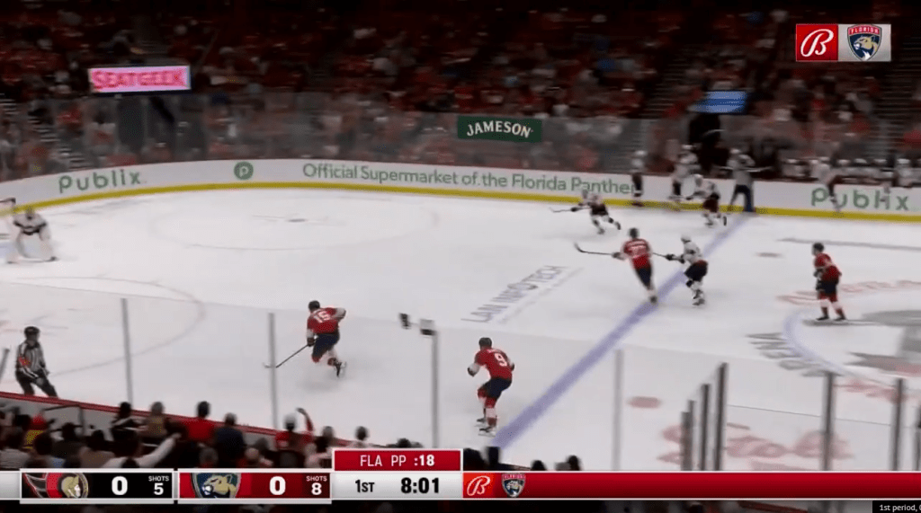 The interesting part is that this is the second period, so there is a long change. Ottawa had cleared the puck seconds earlier, but it only gets to the red line rather than deep into Florida’s Zone. Claude Giroux goes for the change seven seconds after a face off (?) but because it’s a long change, and the puck only gets to the red line, Barkov can whip the puck across the ice to the area left empty by the changing forward. It is hard to see behind the logo on the top right, but you can see the change happen as Barkov circles with the puck: