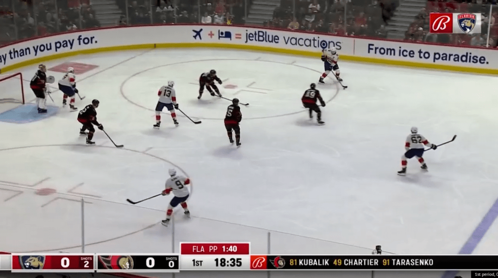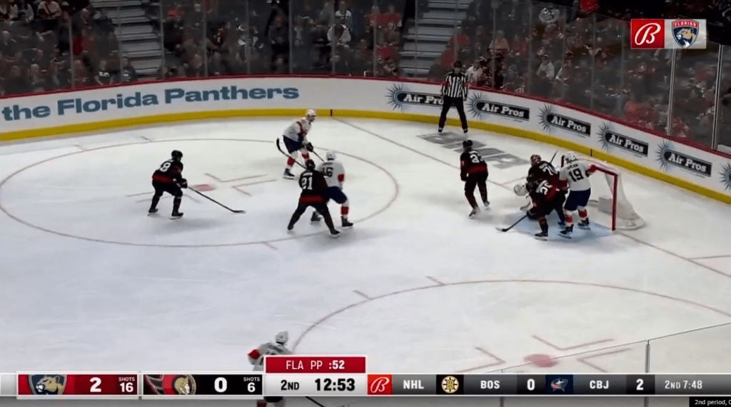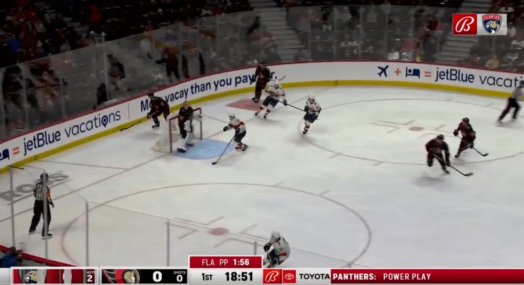 That puck goes to Sam Bennett, who is able to delay long enough at the blue line to let his wingers catch up on the far side. Because that was an easy cross-ice pass for Barkov, and Ottawa doesn’t want to let Bennett just walk to the top of the circle with the puck, the Ottawa defenceman puts pressure on Bennett. However, the changing forward is also coming from the bench to put pressure on Bennett, which leaves just two Ottawa defenders (one of them a forward) to guard about 98% of the defensive zone: