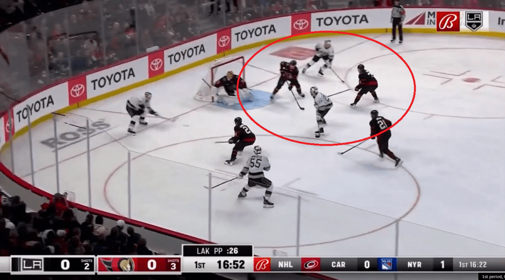 A week later, Los Angeles is in town. Early in the game, the Sens go on the penalty kill and Korpisalo has already had to make a couple of nice saves in addition to Kevin Fiala hitting a post. Los Angeles’s second PP unit hits the ice, and a nice passing play leads to Phillip Danault having not one, but two, clean swipes at the puck from the net-front area. It is another case of clear miscommunication because Ottawa’s weakside forward has recognized the backdoor pass and has dropped down below the hashmarks to cut it off. However, Tyler Kleven stays right in front of Korpisalo, leaving Danault wide open about 15 feet from the goal line: