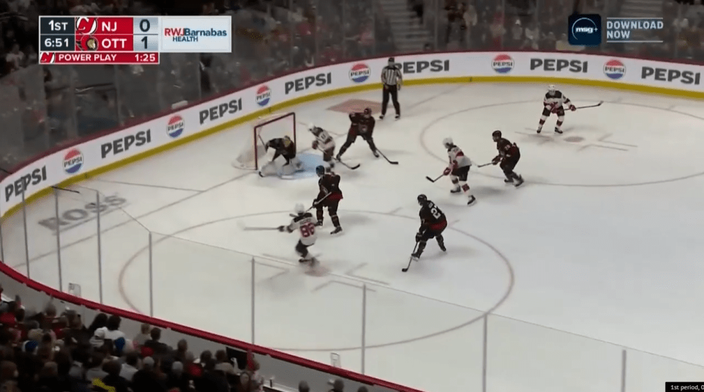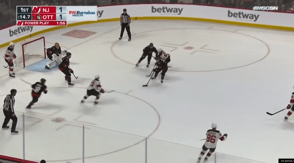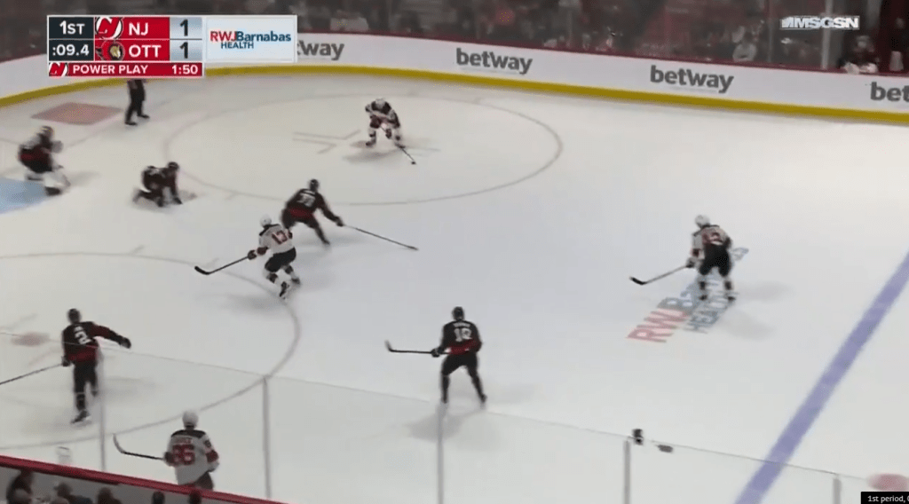 The Devils scored later in the first period as Ottawa has very good chances to get the puck out and fail to do so. The first is Stützle failing on this backhand: