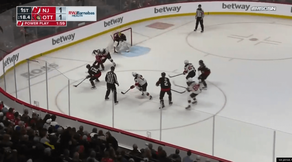 The next game we’ll show is the end of December, a 6-2 loss to New Jersey when Jacques Martin has fully taken over behind Ottawa’s bench. Ottawa again allowed two PP goals against and the first is on a moving screen like we saw from Boone Jenner in Columbus a couple of games ago: