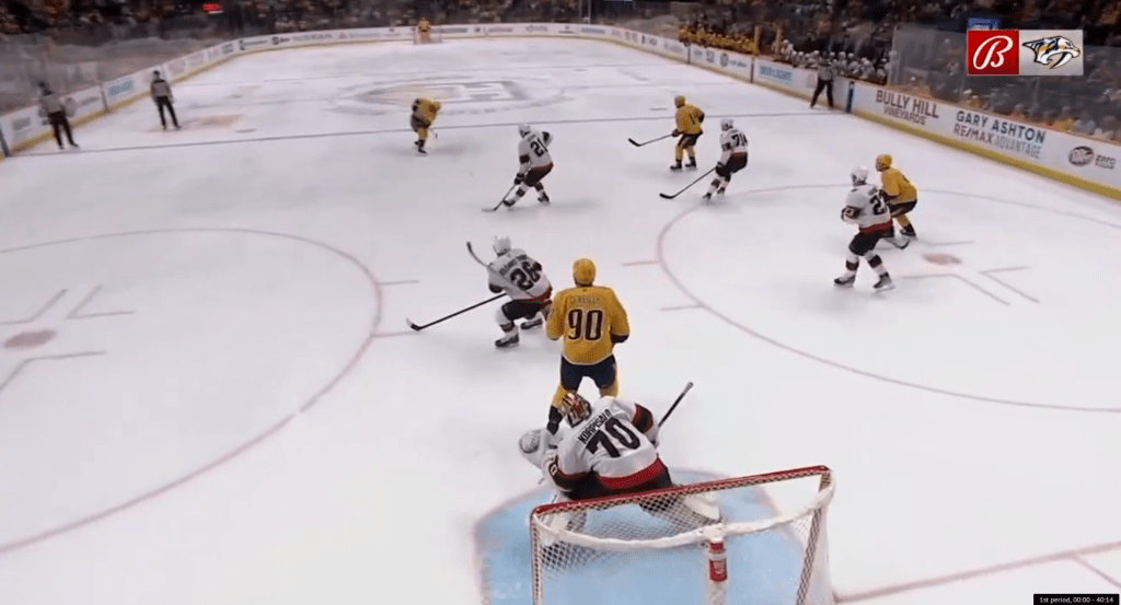 In February, a 4-1 loss in Nashville had one PP goal against and it’s another goal where the Ottawa skater in front of the net does all of the following: doesn’t take a man, doesn’t block the shot, and provides a screen. It truly is something to behold, and this is how point shots find their way to the back of the net: