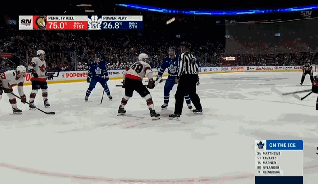 A week later in Toronto, Ottawa loses the faceoff and no one gets out to William Nylander in time, who fires it home from the middle of the ice: