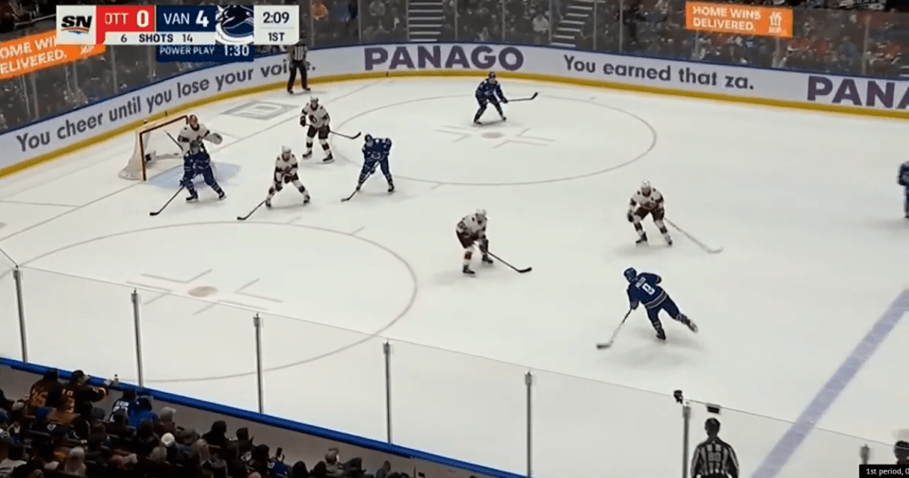 In early January, Ottawa lost 6-3 in Vancouver, giving up five first-period goals. Elias Pettersson ripped home a cross-ice pass from JT Miller, and it’s yet another case where an Ottawa penalty killer has his stick in the passing lane to the defenceman rather than the shooter in the circle: