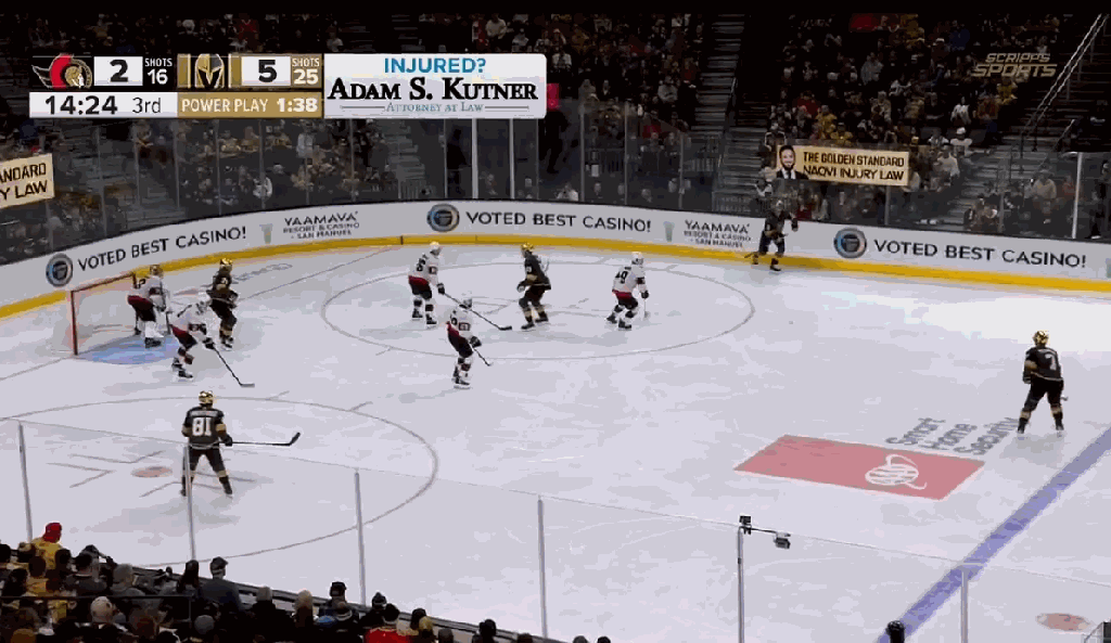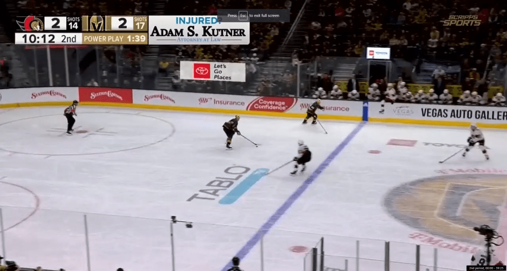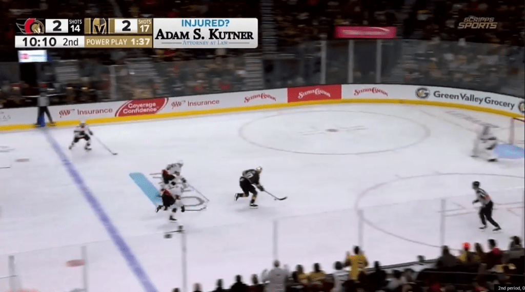 A few days later, Ottawa was in Vegas and things didn’t go well by giving up two more power play goals against in a 6-3 loss. The first was a wild one as Ben Hutton was bringing the puck up the ice and the *entire way* he’s starting down Nicolas Roy: