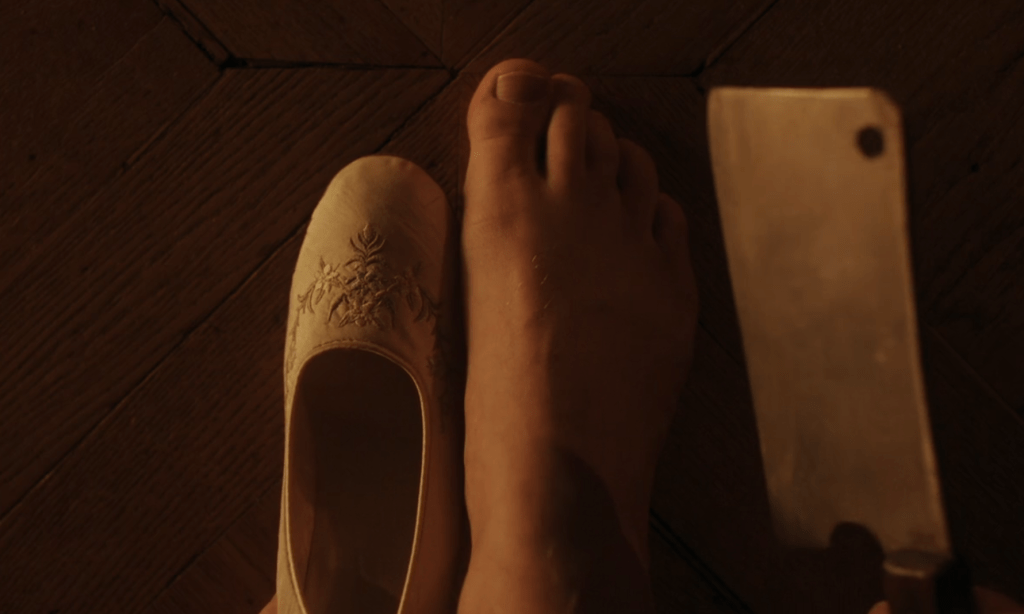 I won’t link a video here – this film genuinely grossed me out at times – but there is the infamous slipper scene from Cinderella. The twist here is that the feet of Elvira, our main character, don’t fit the slipper. Then we get this: